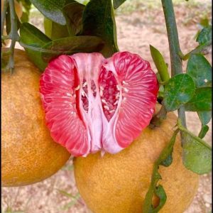 Giống Bưởi Đào Tân Lạc Hòa Bình (bưởi Đỏ Tân Lạc) có quả hình tròn, vỏ mầu vàng khi chín múi bưởi có mầu hồng đỏ, quả có khối lượng trung bình từ 1,2kg – 1,4kg/quả. Tép bưởi Tân Lạc có mầu đỏ hồng,bó chặt, dễ tách, ăn rất giòn ngọt và không bị he đắng. Cây bưởi Đào Tân Lạc Hòa Bình (bưởi Đỏ Tân Lạc) cho năng xuất rất cao và ổng định, với cây 7 năm tuổi cho năng xuất từ 260 – 320 quả/cây.